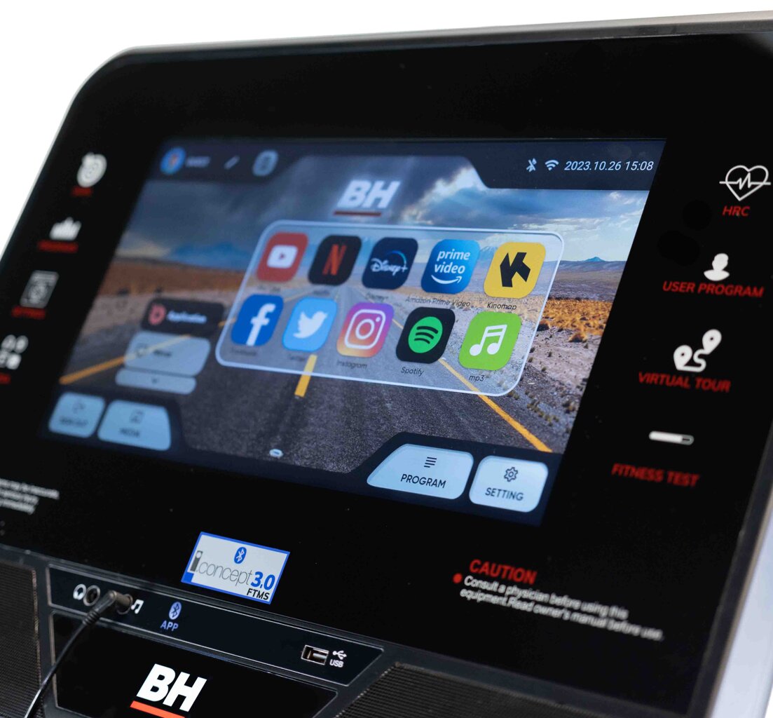 Ovládací konzole trenažeru BH Fitness RS2000 TFT je vybavena velkým 16" dotykovým TFT displejem, který kromě zobrazení všech důležitých tréninkových údajů nabízí i široké multimediální možnosti. Ovládání je intuitivní, rychlé a přehledné, a to jak přes hlavní dotykovou obrazovku, tak i díky přímým tlačítkům a ovládacím prvkům na madlech. K dispozici je 25 tréninkových programů, 3 HRC programy, 5 uživatelských profilů, Body Fat test a fitness test. Samozřejmostí jsou také rychlé volby rychlosti a sklonu pomocí tzv. hot keys. Součástí výbavy je také měření tepové frekvence přes dlaňové senzory a trenažér je kompatibilní s analogovým hrudním pásem o frekvenci 5 kHz i Bluetooth hrudním pásem, takže si můžete sledování tepu přizpůsobit podle preferovaného způsobu měření.
