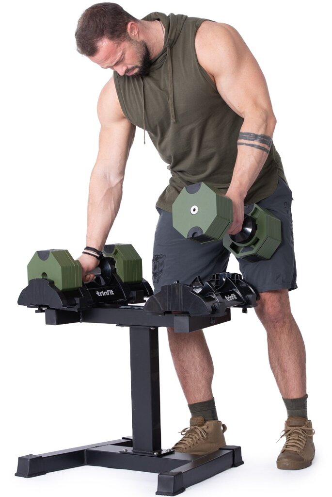 Stojan pro činky TRINFIT OctaBlock - Součástí setu je také robustní a praktický stojan, který zajistí přehledné a bezpečné uložení činek. Díky kompaktním rozměrům se stojan hodí do každé domácí posilovny. Je vyroben z masivní oceli s odolnou povrchovou úpravou a jeho konstrukce je uzpůsobena pro snadné zvedání činek.