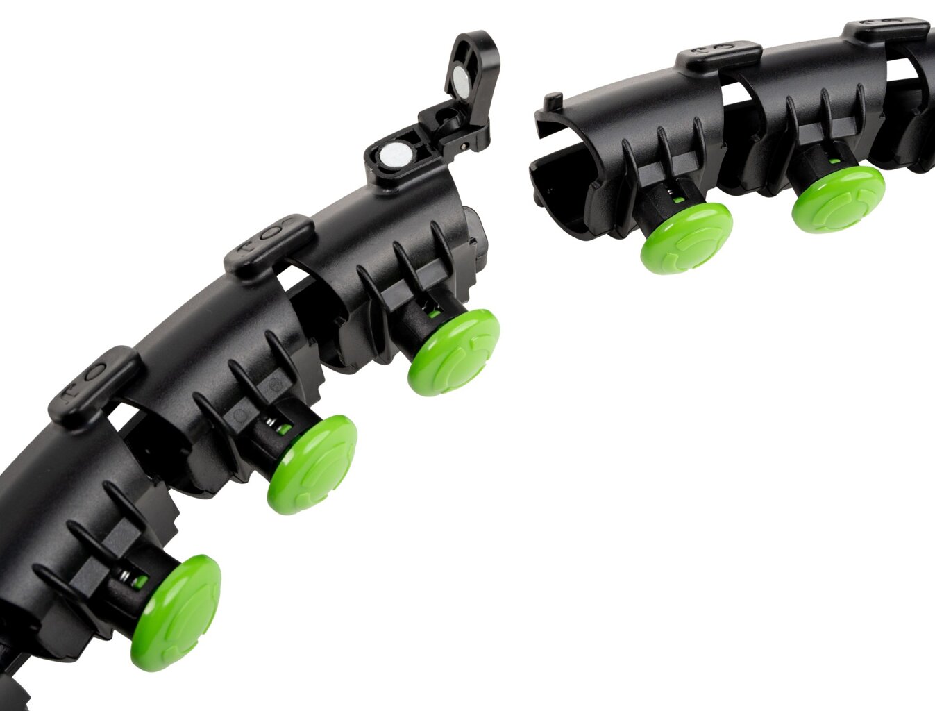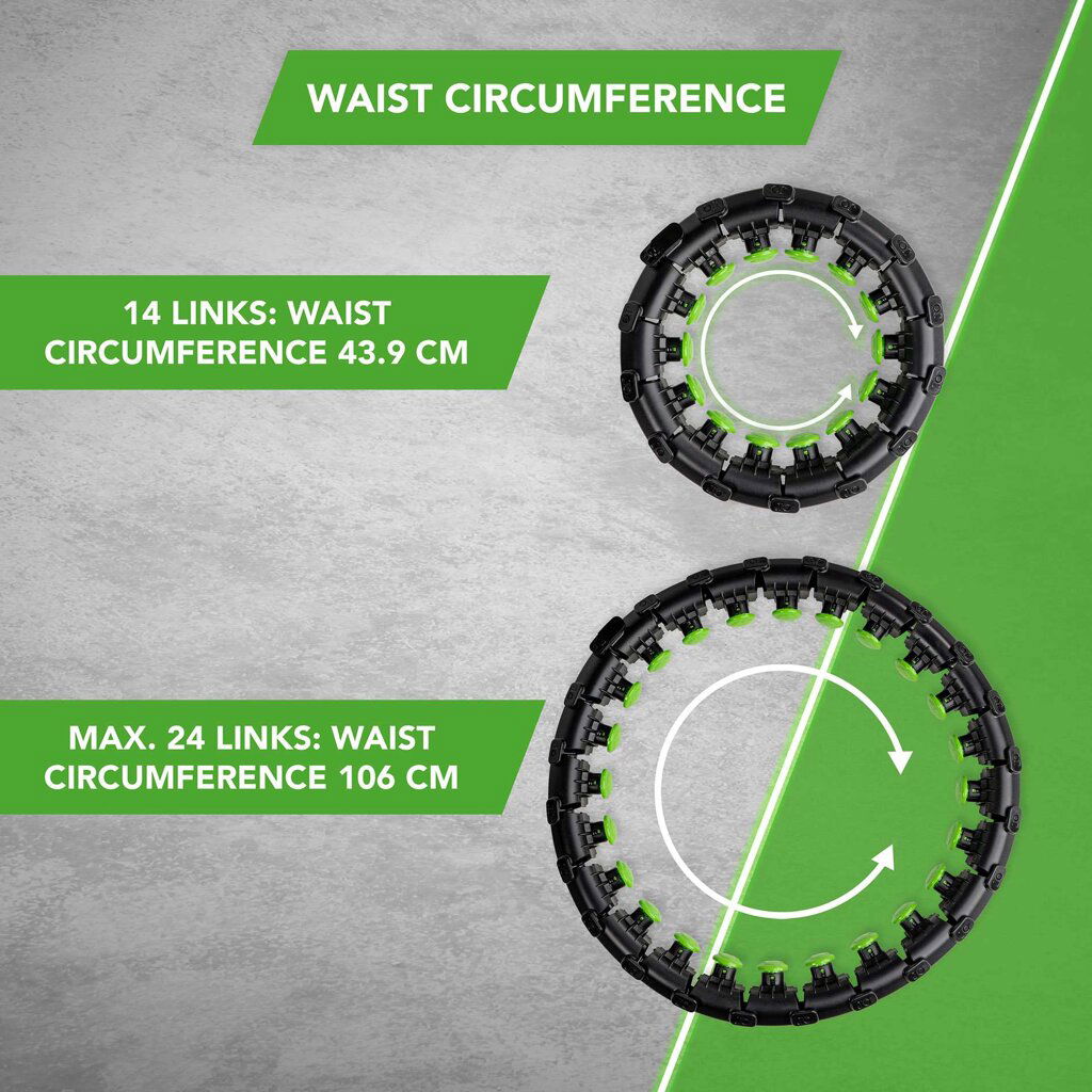 Díky spojovacím dílům si můžete obruč nastavit přesně na vámi preferovanou velikost. Jednoduše zacvaknete díly na místo, kde potřebujete, čímž získáte obruč o obvodu 44 až 106 centimetrů / 17,3 až 41,7 palce (14-24 spojovacích dílů). Pevným obepnutím kolem pasu, můžete pokračovat ve cvičení, aniž byste ztratili plynulost, protože obruč nemůže nikdy spadnout z vašich boků na podlahu. Každý článek má také hrot, který masíruje vaše břicho a pas. To pomáhá zlepšit krevní oběh, takže se rychleji odstraňují tělesné odpadní látky.