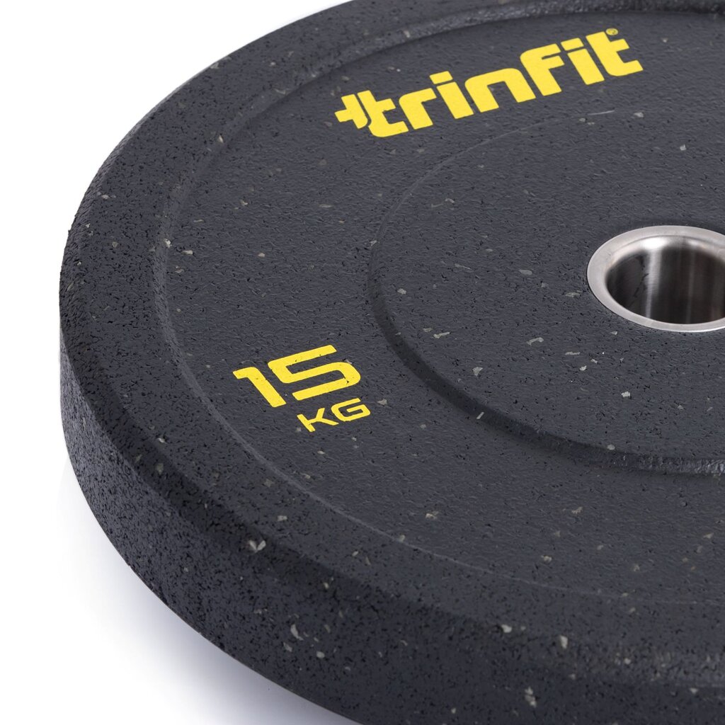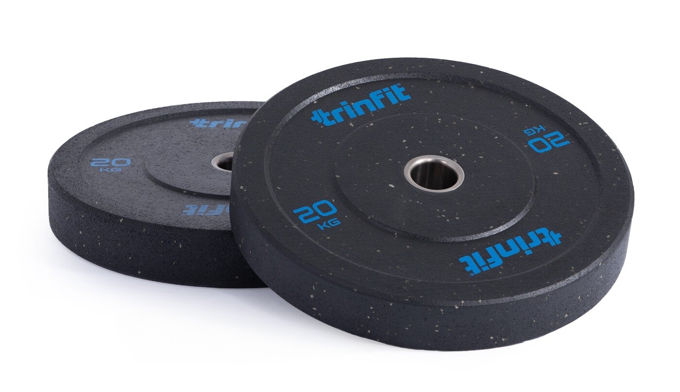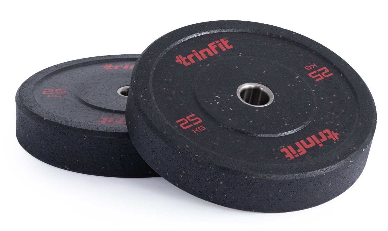 Set doplňují olympijské kotouče TRINFIT HI-TEMP, které jsou navrženy tak, aby obstály i při každodenním používání v crossfitových a komerčních posilovnách. Jsou vyrobeny z pevné směsi lisované pryže technologií Hi-Temp, při níž se materiál stlačuje pod vysokým tlakem a teplotou. Díky tomu vzniká mimořádně hustý a pružný povrch, který efektivně tlumí nárazy, snižuje hluk a odolává deformaci i při častém odhazování činky. Jemně zrnitá textura zlepšuje manipulaci a zajišťuje jistý úchop při přenášení. Vyšší odskok kotoučů zaručuje pružný, ale kontrolovaný dopad, ideální pro crossfitové a vzpěračské tréninky.