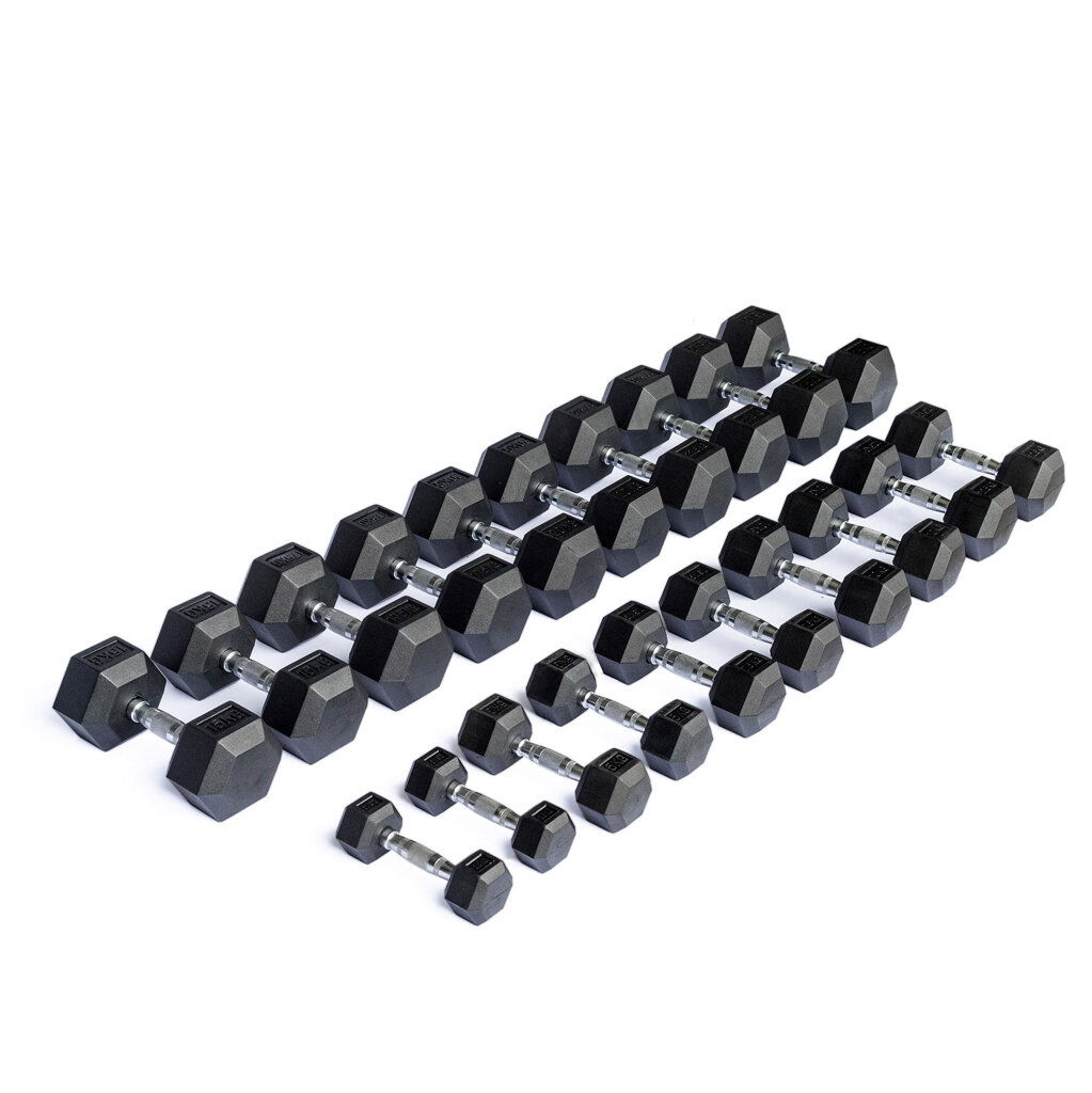 Profesionální sada pogumovaných jednoručních činek se skládá z 10 párů činek v rozmězí 2,5 až 25 kg po 2,5 kg. Činky mají pevnou konstrukci a odolnou gumovou povrchovou úpravu. Ergonomicky tvarovaný chromovaný úchop umožňuje pevný úchop a pohodlné, bezpečné cvičení. Pevná závaží mají v řezu praktický tvar šestiúhelníku, aby nedocházelo k samovolnému pohybu činky po doložení.
