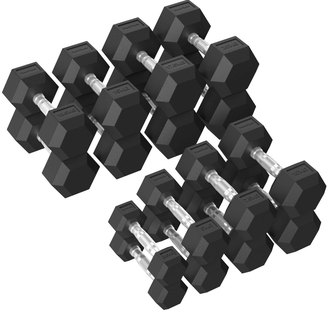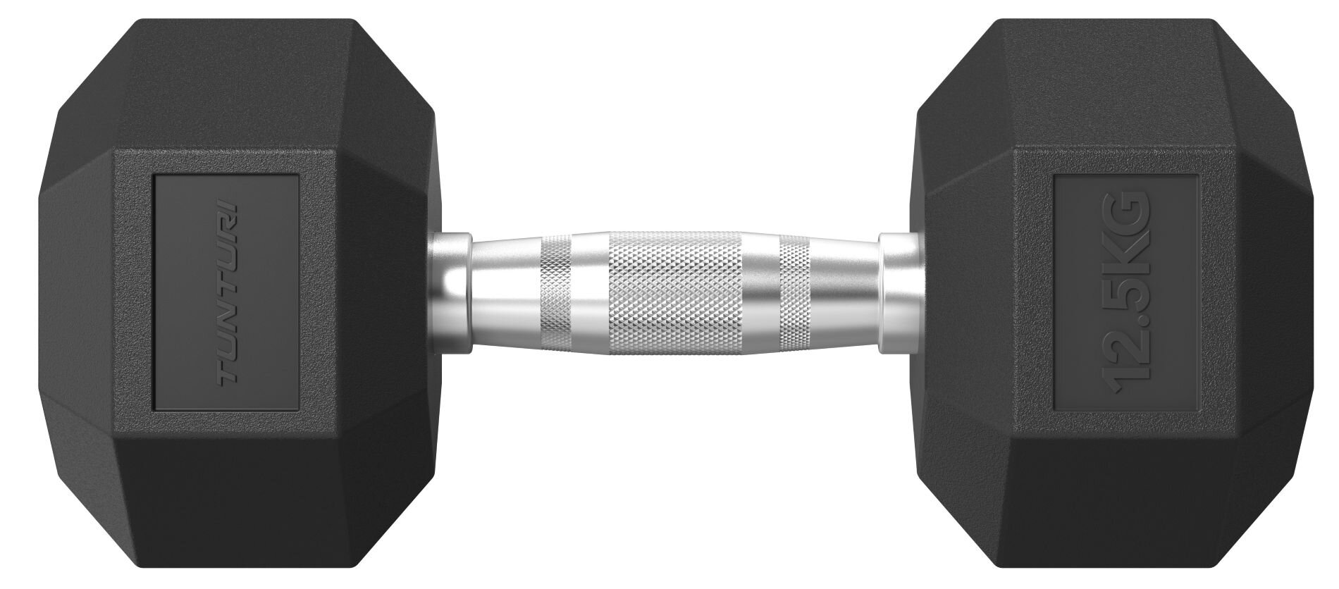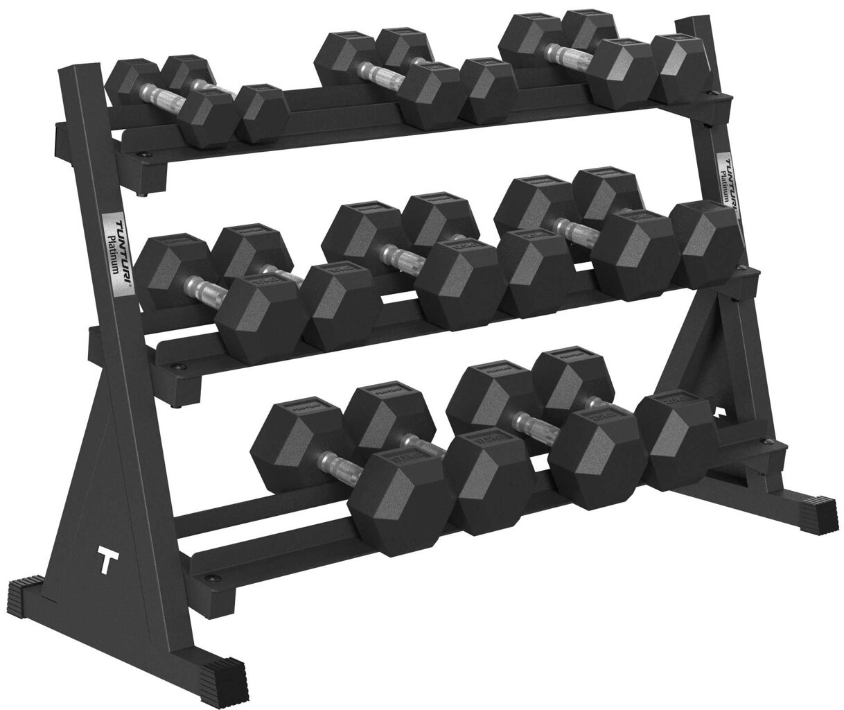 Sada jednoručních činek TUNTURI Platinum Hexa 2,5–20 kg se stojanem je profesionální silový set určený pro komerční fitness centra, osobní tréninková studia i náročné domácí uživatele. Obsahuje 8 párů jednoručních činek s odstupňováním po 2,5 kg a robustní ocelový stojan, který zajišťuje přehledné, bezpečné a ergonomické uložení celé sady.