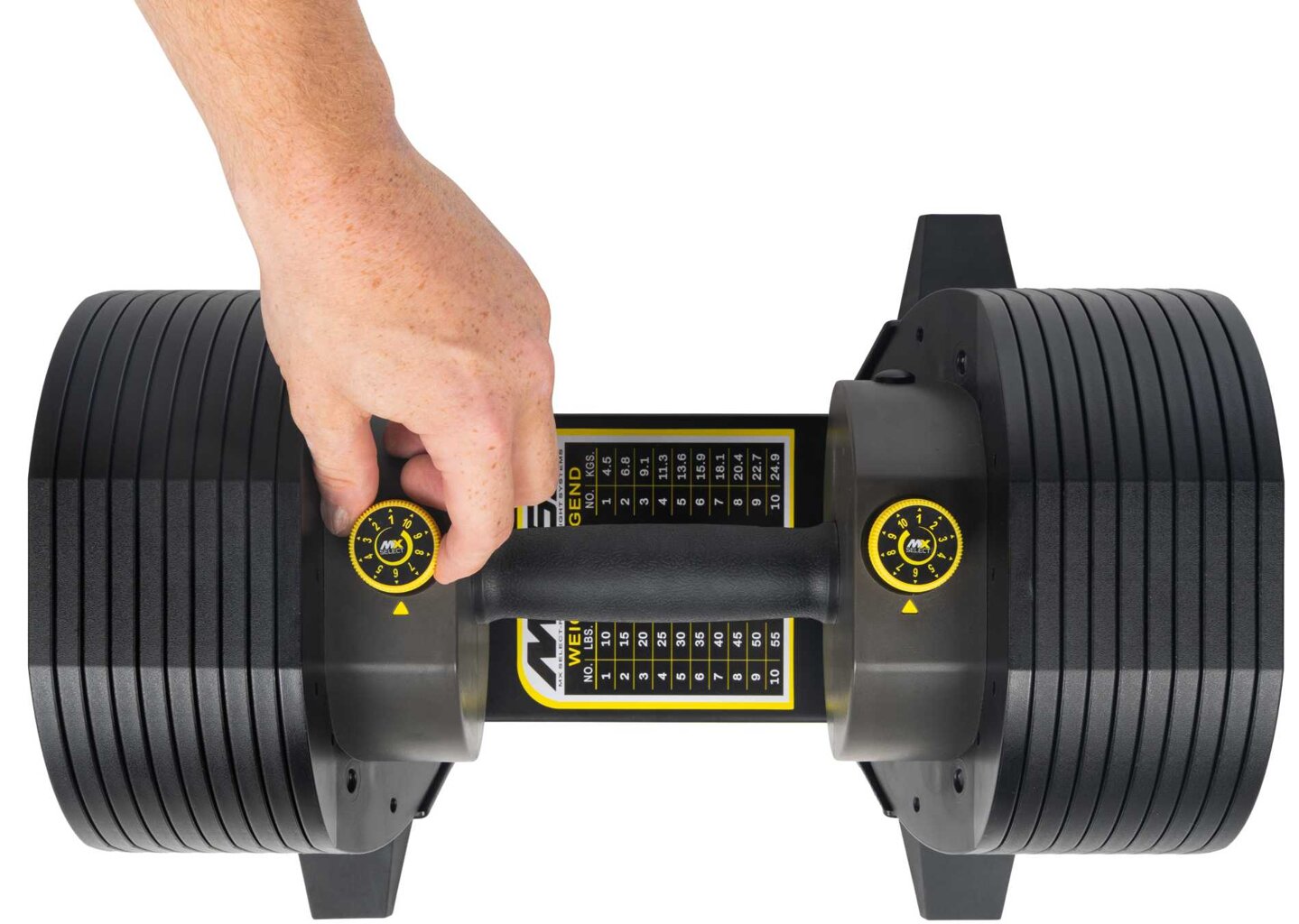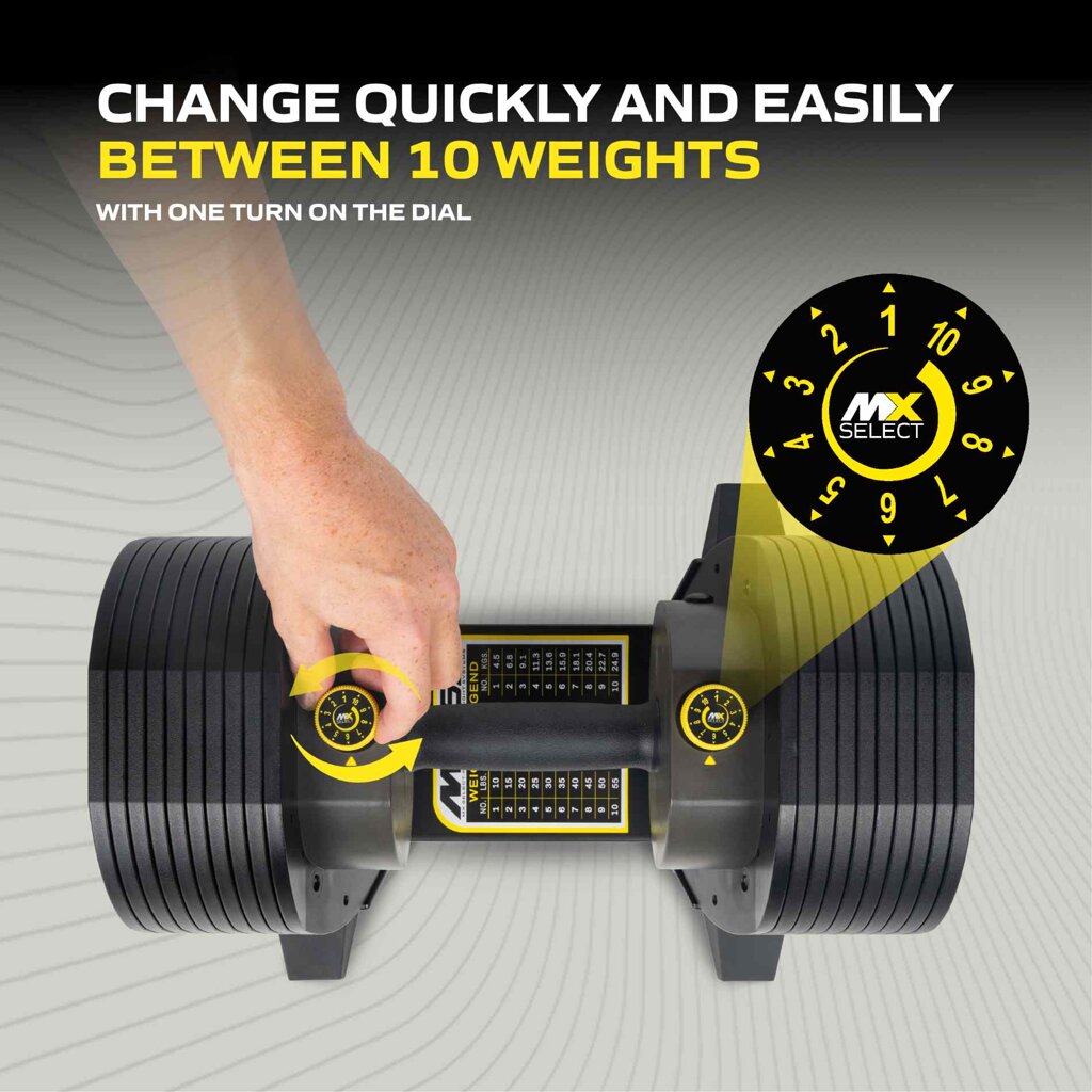 Set TUNTURI MX55 Select spojuje špičkové nastavitelné činky nové generace s praktickým odkládacím stojanem. Umožňuje pohodlný, bezpečný a kompaktní silový trénink doma i v menším fitness. Jediným otočením voliče zvolíte během pár vteřin jednu z deseti hmotnostních variant v rozsahu od 4,5 do 24,9 kg, takže není potřeba žádná manipulace s kotouči ani přerušování cvičení.
