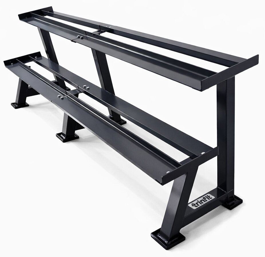 Konstrukce stojanu je vyrobena z odolných ocelových profilů s důrazem na tuhost a stabilitu při zatížení až 1000 kg. Dvě dlouhé odkládací úrovně umožňují ergonomické a přehledné uložení celé sady jednoručních činek. Odkládací plochy jsou tvarovány tak, aby činky bezpečně seděly na místě a zároveň byla manipulace rychlá a komfortní. Plastové ochranné patky na spodní části stojanu chrání podlahu a zvyšují stabilitu i na hladkém povrchu.