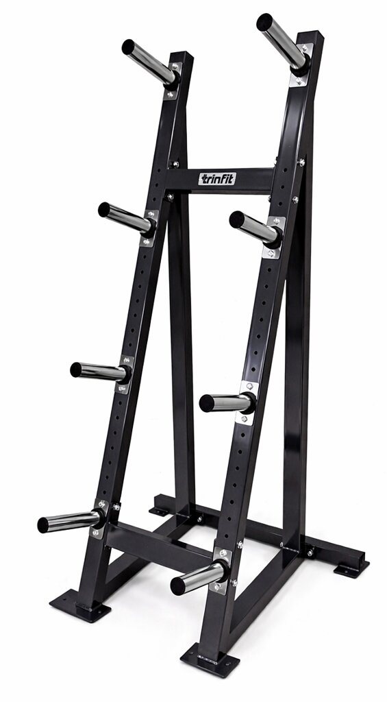 Stojan je osazen 8 trny pro olympijské kotouče o průměru 50 mm, což umožňuje přehledné rozdělení kotoučů podle hmotnosti a rychlou manipulaci během tréninku. Trny jsou vyrobeny z oceli s galvanicky pokoveným povrchem pro hladké nasazování a zvýšenou ochranu proti korozi. Díky trojúhelníkové konstrukci a vysoké vlastní hmotnosti nabízí stojan výjimečnou stabilitu i při maximálním zatížení. Trny na kotouče jsou nastavitelné dle potřeby, což umožňuje přizpůsobení stojanu konkrétním požadavkům uživatele.