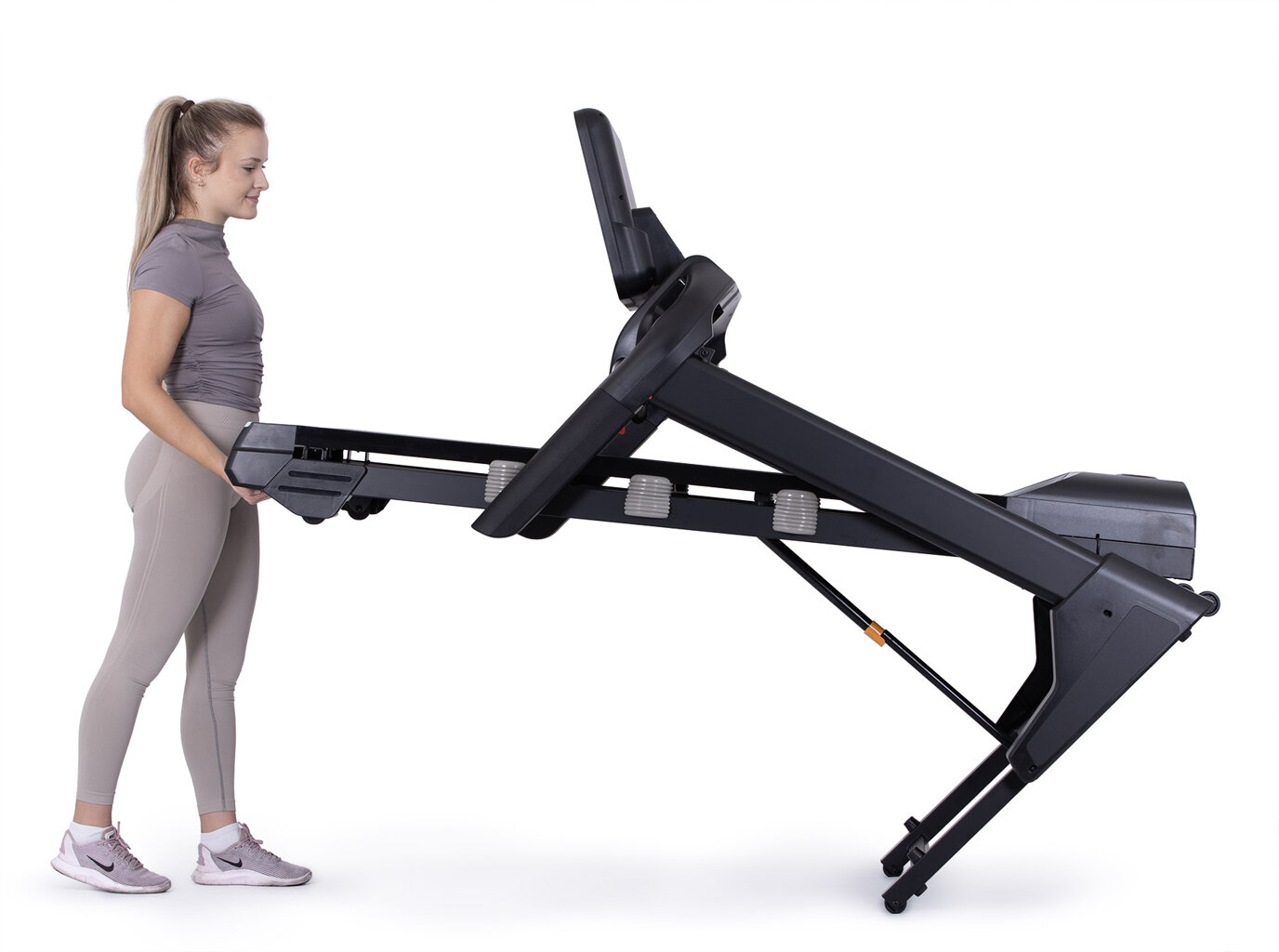 Pokud běžecký pás zrovna nepoužíváte, můžete jej jednoduše sklopit a ušetřit tak až 60% místa. Sklopení a manipulaci s pásem usnadňují i transportní kolečka.