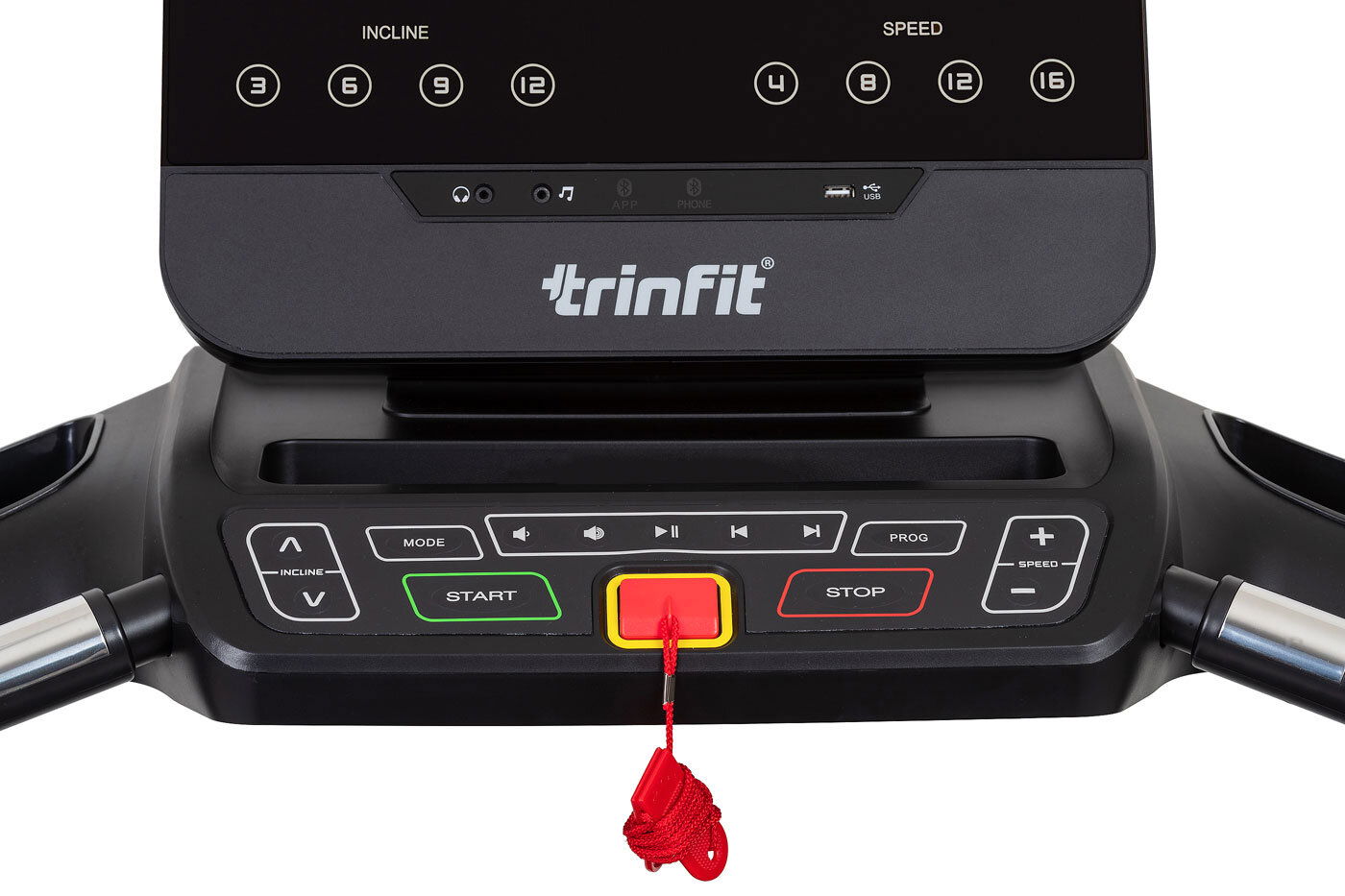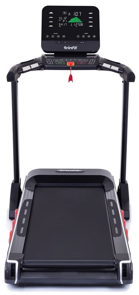 TRINFIT Gara T800i Sport nabízí velký, přehledný a podsvětlený LCD displej s bohatou programovou nabídkou pro efektivní a zábavný trénink. Umožní vám sledovat váš trénink v reálném čase pomocí dat monitorujících vaši rychlost, čas, vzdálenost, spálené kalorie a srdeční frekvenci. Rychlost a sklon běhu si můžete nastavovat během tréninku ručně tlačítky, případně si můžete si vybrat některý z 64 přednastavených tréninkových programů, nebo si vytvořit 3 vlastní programy na míru podle vašich představ. Pro maximální efektivitu tréninku můžete využít měření tepové frekvence skrz dlaňové snímače tepové frekvence (tzv. Hand pulse) na madlech trenažéru, nebo přes analogový hrudní pás nekódovanou frekvencí 5 kHz. S tepovou frekvencí souvisí také programy ovládané podle zadané tepové frekvence tzv. HRC programy, které vám pomohou se zaměřit na hubnutí, nebo budování fyzické kondice. K dispozici jsou 3 HRC programy.