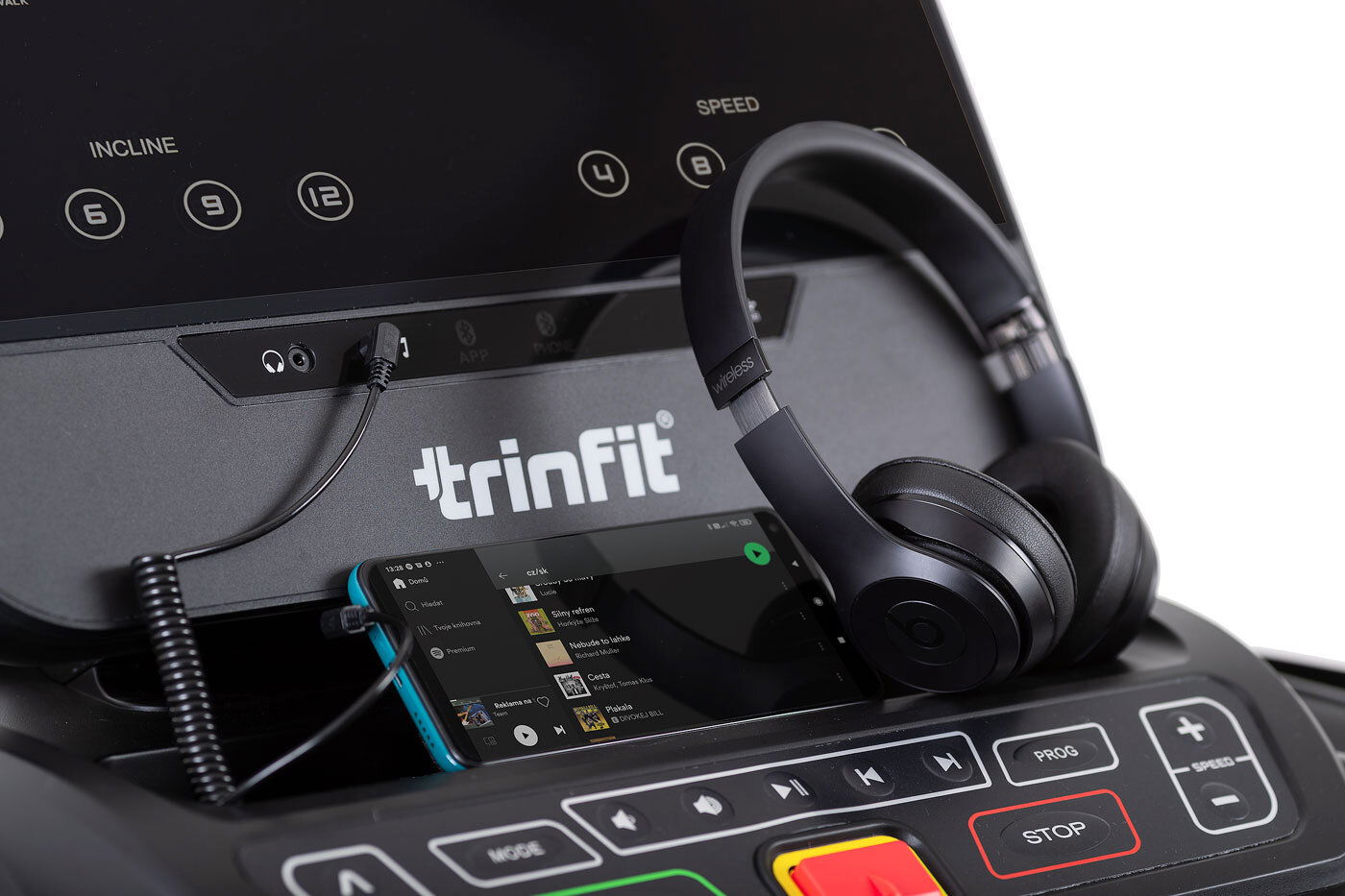 Díky funkci Bluetooth je možné běžecký pás spárovat s chytrými zařízeními pro poslech hudby ze zabudovaných reproduktorů a také můžete využívat tréninkové aplikace. Vyobrazený tablet není součástí dodávky.