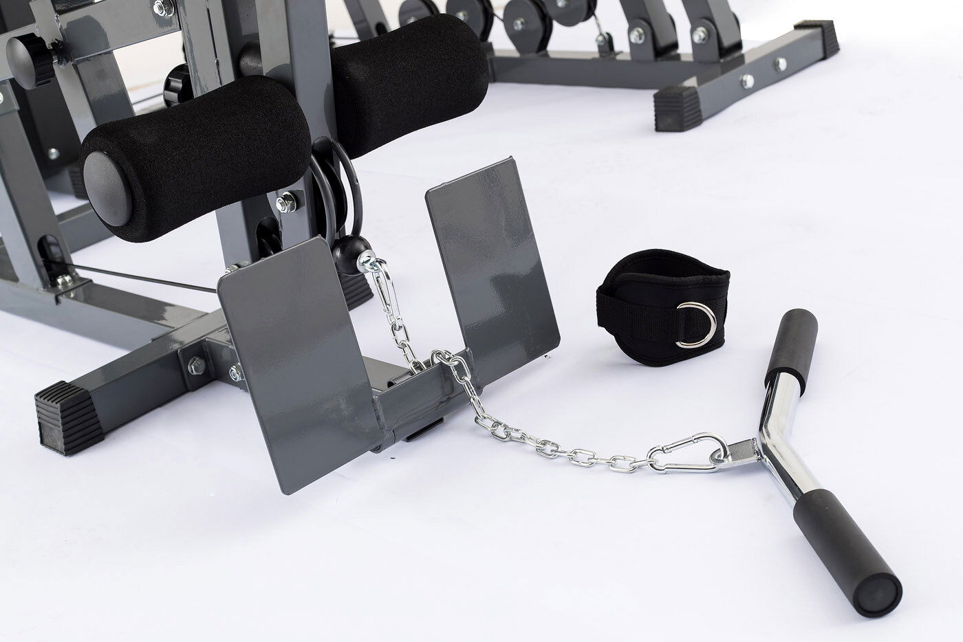 - spodní kladka - pro veslování, posilování bicepsu a dlaších cviků, speciální polohovatelné opěrky nohou pro možnost zapření
