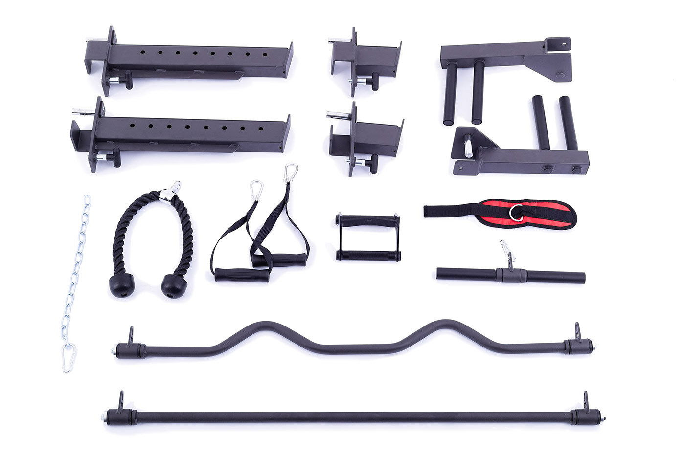 Součástí posilovací klece TRINFIT Multi Smith CX60 je velké množství adaptérů: jednoruční adaptéry, dlouhý rovný adaptér, dlouhý EZ adaptér, tricepsové lano, kotníkový adaptér, V-adaptér pro veslování, krátký rovný adaptér, háky na velkou osu, bezpečnostní dorazy a adaptéry na tricepsové kliky tzv. dipy.