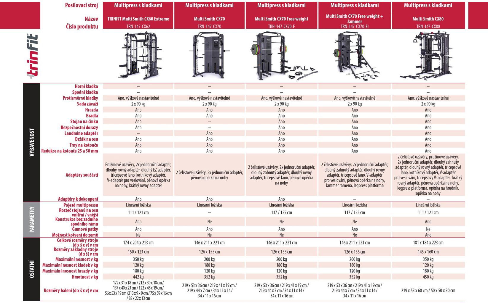 Multipress TRINFIT Multi Smith CX70 nabízí dva zásobníky zátěže o váze 90 kg (dohromady tedy až 180 kg závaží!). Zároveň nabízí nepřeberné množství druhů cvičení formou tricepsových kliků, tlaků na prsa, ramena, kladek atd.. Dvě protisměrné kladky je možné polohovat v 17 výškových polohách, můžete tak perfektně procvičit celé tělo.