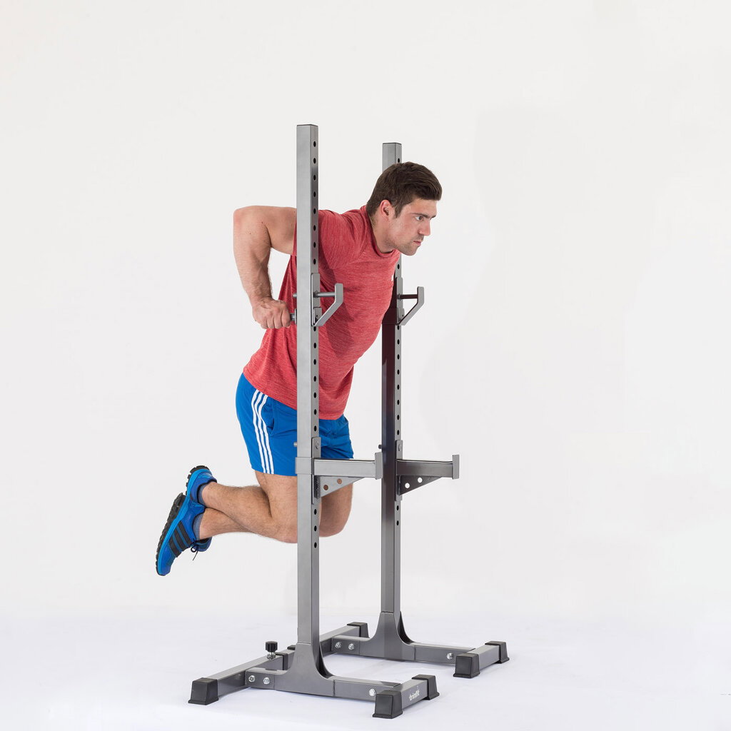 Velkou výhodou je nastavitelná rozteč stojanu, lze ho tedy přizpůsobit jakékoli čince a jakýmkoli potřebám. To umožní pohodlné a komfortní cvičení, optimální úchop a bezpečné odkládání činky drobnějším i vyšším osobám. Další výhodou je jednoduché výškové nastavení háků na činku v rozsahu 42 až 167 cm a je tedy použitelný pro všechny cviky a všechny výšky postav až do 210 cm. Kromě vlastních odkládacích háků je stojan TRINFIT Rack HX7 vybaven i dalšími pogumovanými bezpečnostními odkládacími dorazy na činku pro případ, že ji už nejste schopni zvednout, případně tyto dorazy lze využít i jako odkládací plochu např. při cvičení bicepsu a dalších cviků, nemusíte tak činku odkládat na zem. Na zadní straně stojanu jsou umístěny bradla, u nichž lze spolu se stojanem měnit šířku.