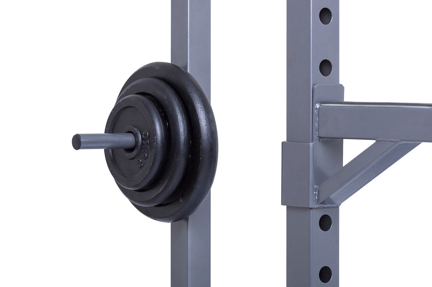 Na boku stojanu jsou instalovány praktické odkládací trny na kotouče, ty lze tedy pohodlně nakládat na činku a po docvičení bezpečně uložit na své místo. Trnů je celkem osm a mají průměr 25 mm a v případě potřeby je lze doplnit adaptérem na olympijské kotouče s vrtáním 50 mm. Adaptéry nejsou součástí dodávky.