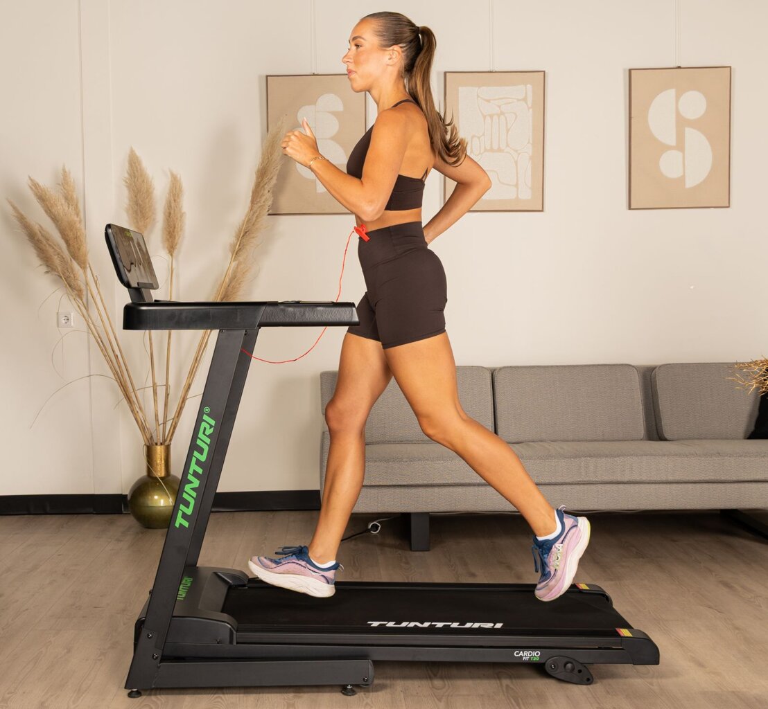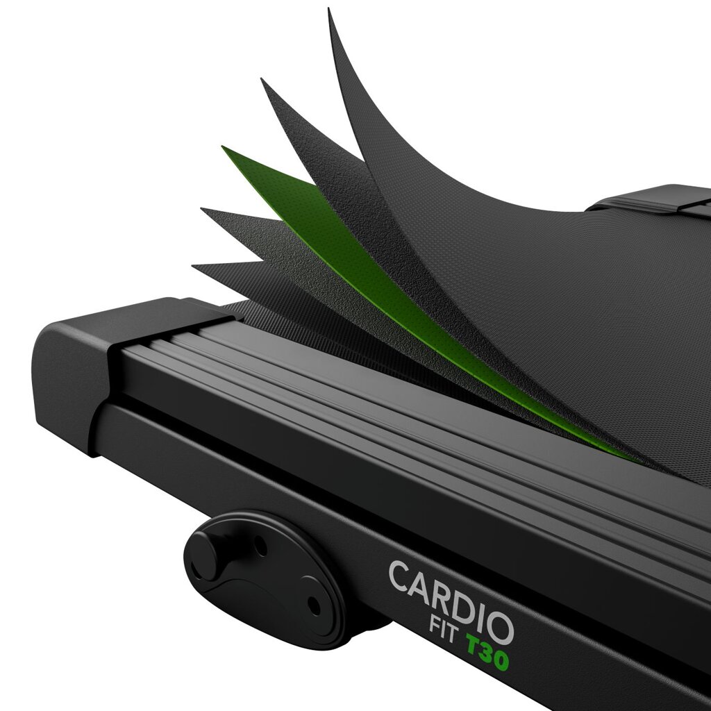TUNTURI Cardio Fit T30 je kompaktní běžecký pás určený pro domácí využití, který nabízí běžeckou plochu 120 × 43 cm, rychlost až 14 km/h, 23 tréninkových programů, manuálně nastavitelný sklon a Bluetooth připojení pro aplikace i hrudní pás.