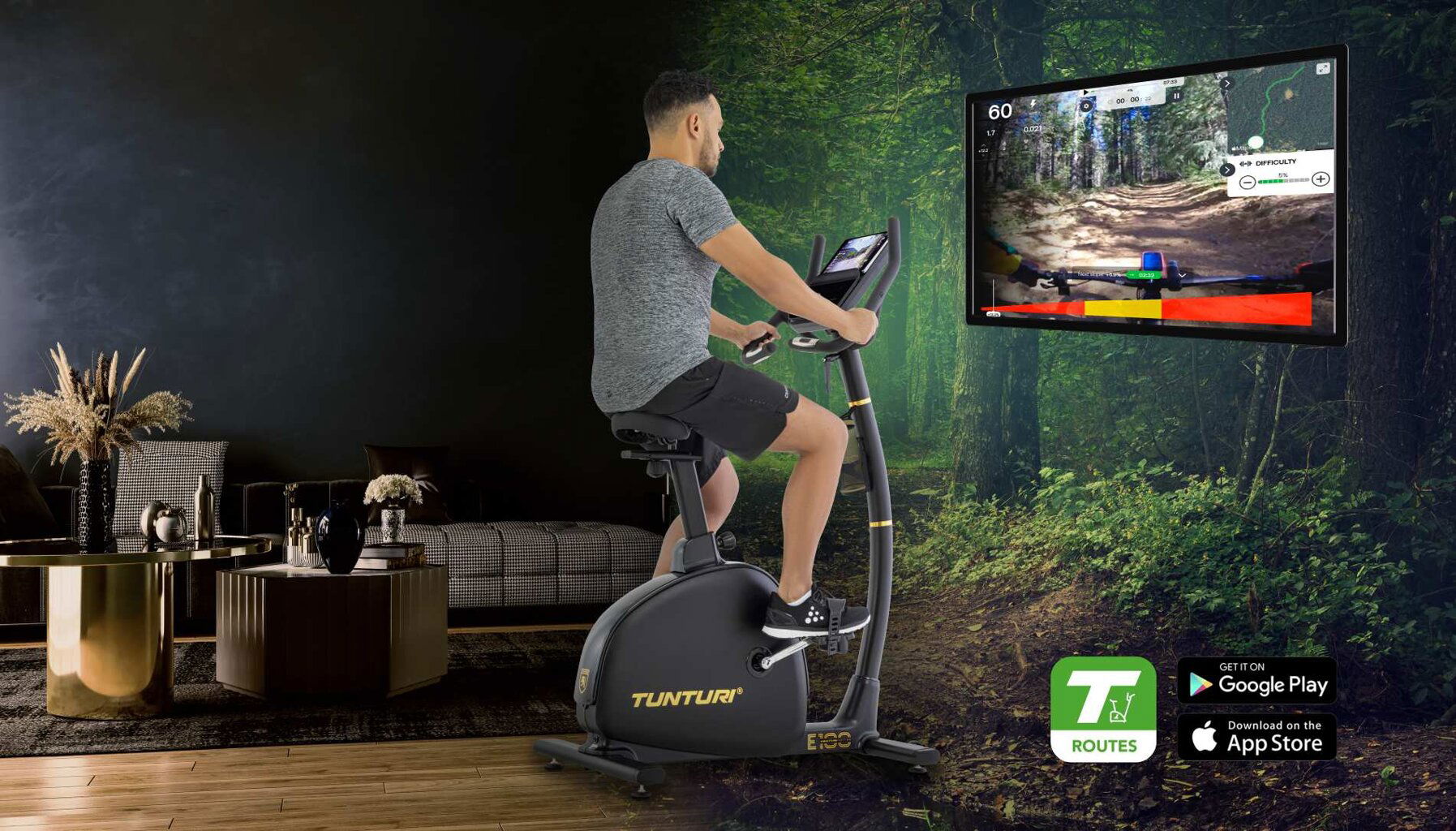 Odpor vašeho trenažéru Tunturi se automaticky synchronizuje s výškovými rozdíly ve videu, takže se zážitek stane ještě více zážitkovým.