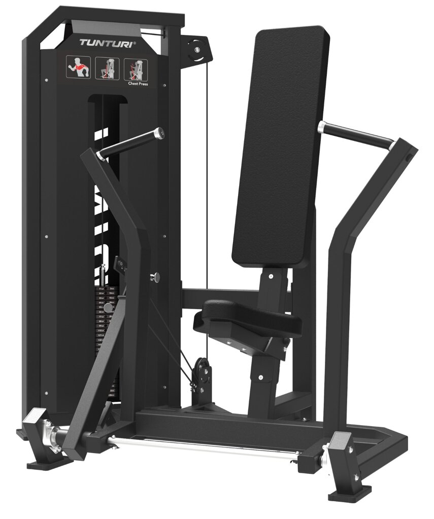 TUNTURI PLATINUM Chest Press Selectorized V-series umožňuje cílený a bezpečný trénink prsních svalů s přirozeným vedením pohybu. Sedadlo lze nastavit do 27 různých poloh a ramena lze nastavit do 5 výchozích poloh, což poskytuje dokonalou přizpůsobivost pro každý typ postavy. Závaží v podobě cihliček má kapacitu 120 kg, Díky přídavnému 2,5 kg závaží lze hmotnost regulovat po 2,5 kg a 5 kg, což dává uživateli plnou kontrolu nad progresí.
