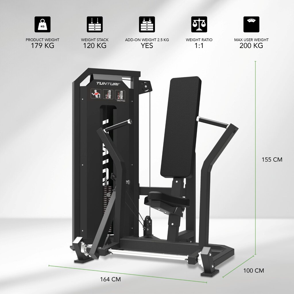 Robustní konstrukce ze 2,5 mm oceli zajišťuje vysokou stabilitu, stroj váží cca 179 kg a je vybaven kvalitním PU čalouněním, které podporuje komfort i při intenzivním cvičení. Vysoce odolné lanko potažené nylonem zaručuje tichý, hladký chod bez trhavých pohybů. TUNTURI PLATINUM Chest Press Selectorized V-series kombinuje elegantní design, robustní konstrukci a profesionální výbavu – ideální volba pro každého, kdo hledá spolehlivý a výkonný stroj pro silový trénink.