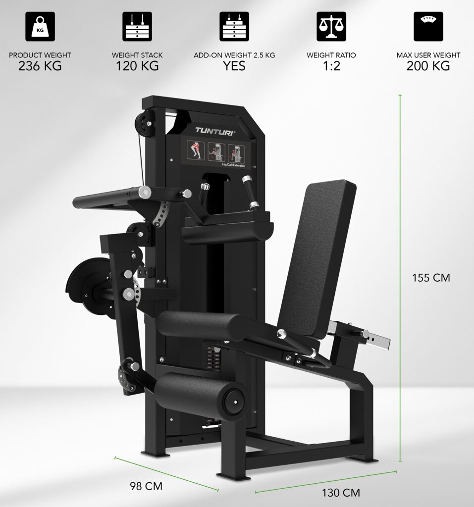 Profesionální posilovací stroj TUNTURI Platinum Dual Leg Curl / Extension z řady V-Series spojuje dva klíčové cviky na nohy v jednom kompaktním zařízení. Umožňuje efektivně posilovat jak přední (kvadricepsy), tak zadní (hamstringy) stranu stehen. Hladce nastavitelné válce a zásobník závaží až do 120 kg s jemným krokem po 2,5 kg zaručují přesné nastavení odporu podle individuální úrovně uživatele.