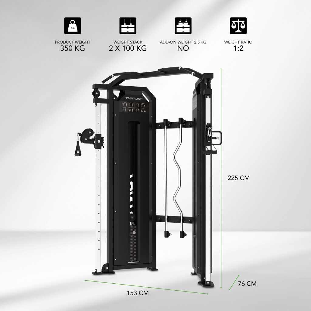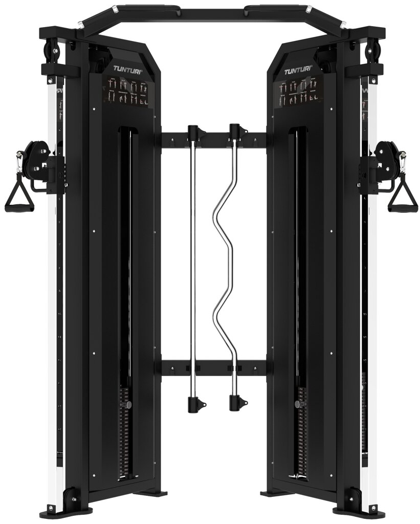 Posilovací věž TUNTURI PLATINUM Functional Trainer Selectorized V-series nabízí širokou škálu cviků pro celé tělo v kompaktním a profesionálním provedení. Disponuje dvěma nezávislými váhovými bloky po 100 kg, které lze nastavovat po 5 kg a jejichž převodový poměr je 1:2. Pomocí 16 poloh kladek si lze trénink přesně uzpůsobit podle cviku a tělesných proporcí. Hladký a tichý kabelový systém zajišťuje plynulý pohyb bez rázů.
