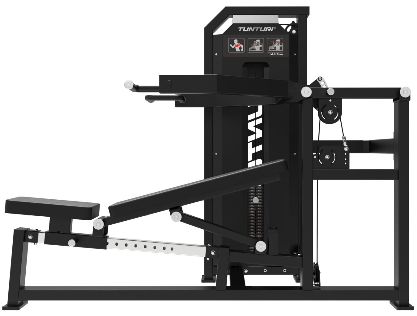 Profesionální posilovací stroj TUNTURI Platinum Multi Press z řady V‑Series je navržen pro všestranné posílení horní poloviny těla – hrudníku, ramen i tricepsů. Díky nastavitelným úhlům tlaku a startovním pozicím umožňuje přesné zacílení různých svalových skupin. Robustní ocelový rám, závaží 120 kg a plynulý chod zajišťují profesionální tréninkové podmínky pro uživatele všech úrovní.