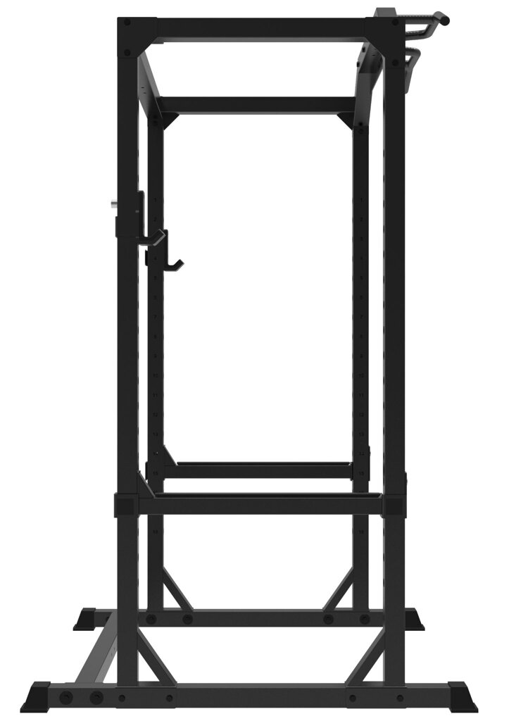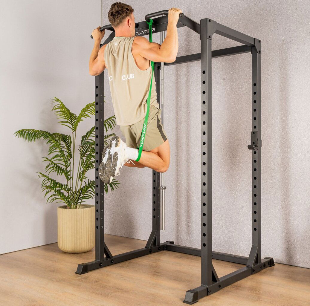 Základ tvoří stojan TUNTURI PR600 Power Rack s výškově nastavitelnými J-háky a bezpečnostními dorazy ve 18 polohách, vhodný pro dřepy, benchpress i další cviky s osou. Víceúchopová hrazda umožňuje variabilní přítahy a posilování horní poloviny těla. Robustní ocelová konstrukce má nosnost 300 kg, takže je vhodná i pro těžké silové tréninky.