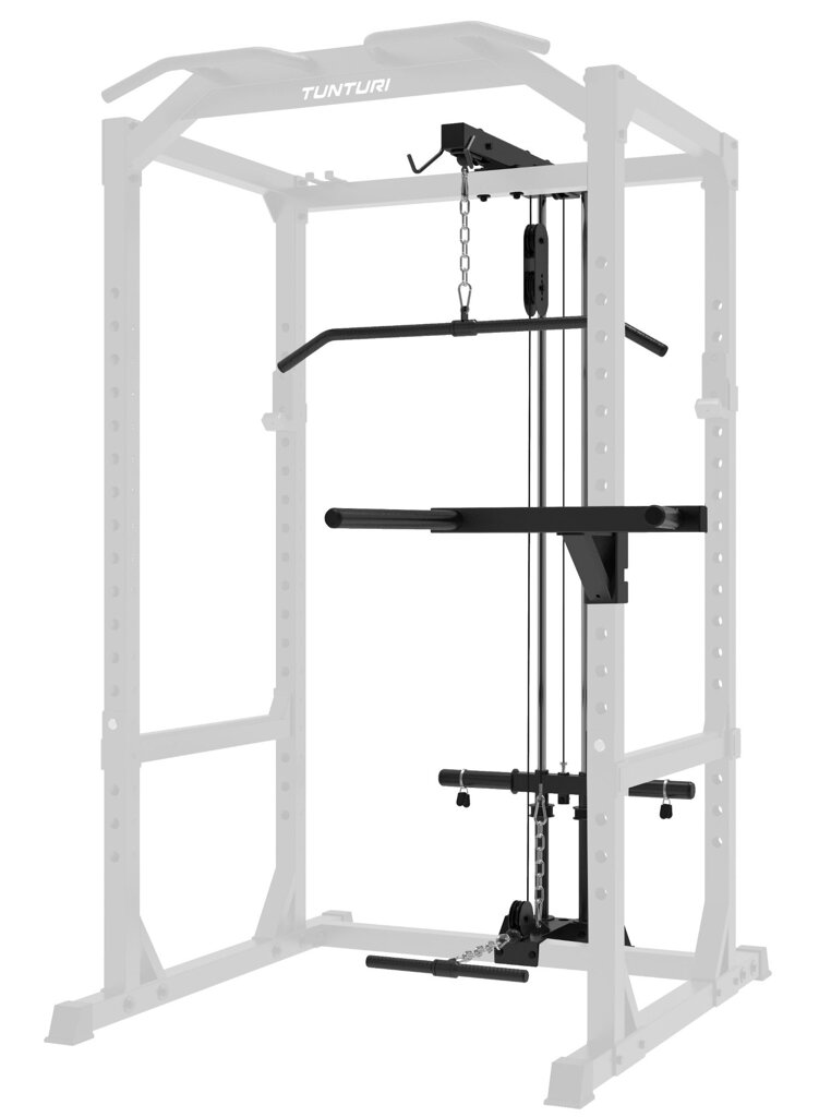 Tato sestava představuje kompletní silovou stanici TUNTURI PR600 Power Rack doplněnou o dva klíčové moduly – horní a spodní kladku a bradla pro kliky na triceps. Výsledkem je všestranný systém vhodný pro trénink celého těla, a to bez nutnosti dalších konstrukcí či zařízení.