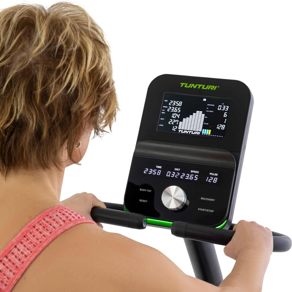 TUNTURI Signature E60 R je vybaven přehledným počítačem s jednoduchým ovládáním a se 7″ LCD displejem. Měří čas, rychlost, spálené kalorie, vzdálenost, frekvenci otáček a srdeční tep prostřednictvím dlaňových snímačů na řídítkách, případně přes hrudní pás s frekvencí 5-5,4 kHz nebo bluetooth. Tréninkový počítač navíc spolupracuje s aplikacemi, díky tomu můžete obohatit svůj trénink o jízdy na různých videotrasách apod.