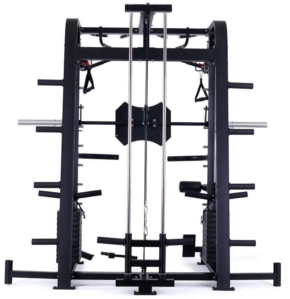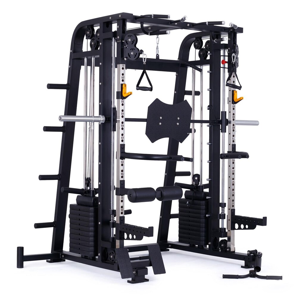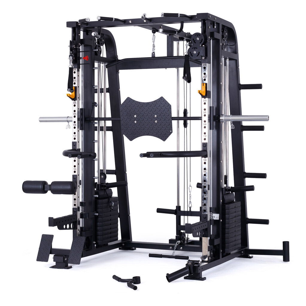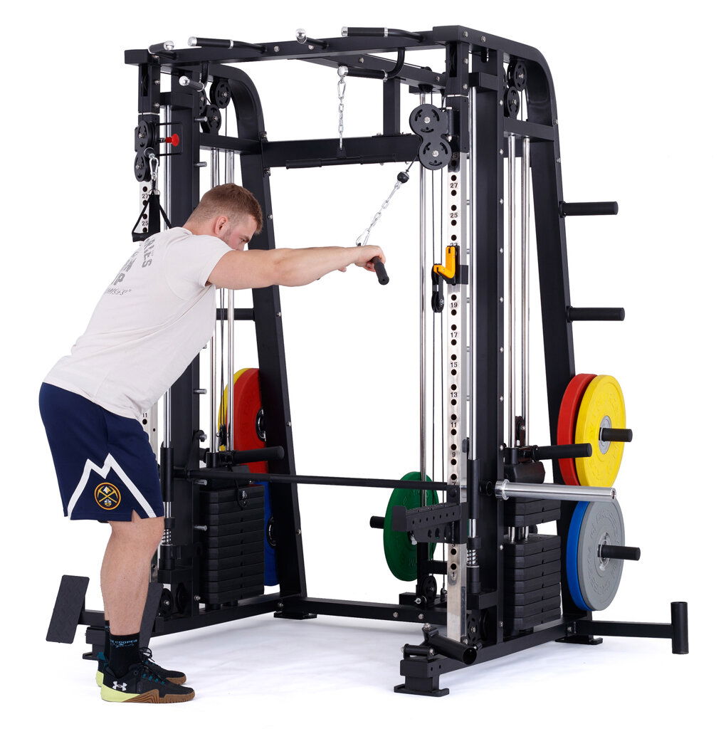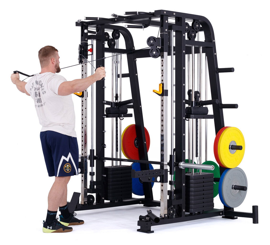 multifunkční multipress se stojanem na činku, výškově nastavitelné kladky, hrazda bezpečnostní dorazy, pojezd lineární ložiska na kotouče s vrtáním 25, 30, 50 mm + sada závaží 2 x 60 kg max. nosnost až 350 kg pro domácí a lehce komerční využití záruka 2 roky