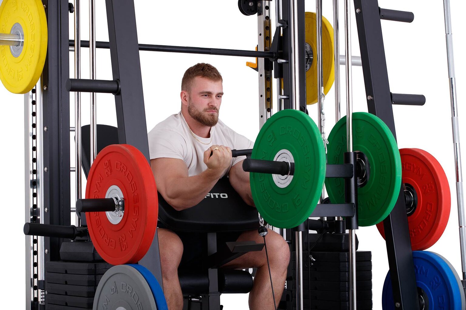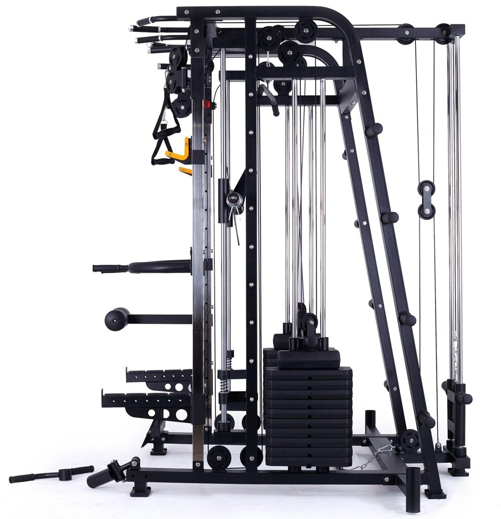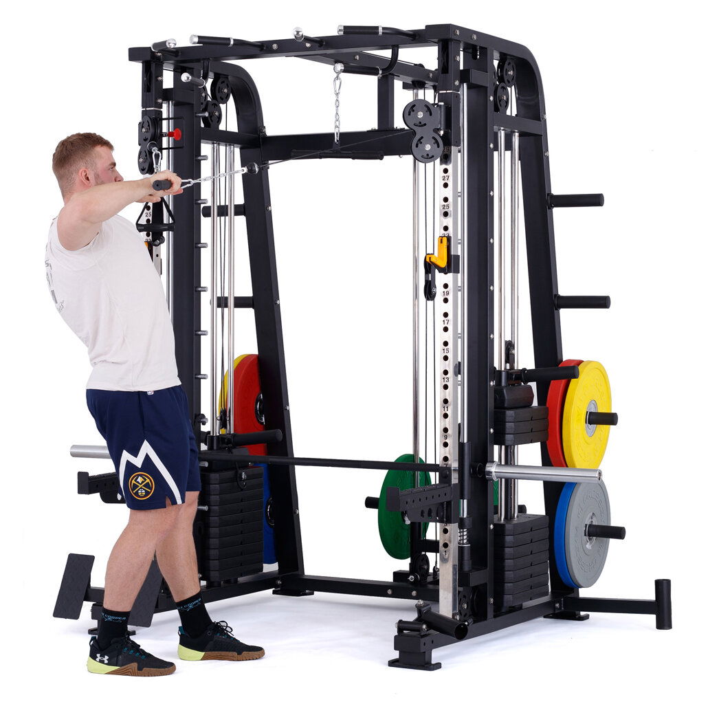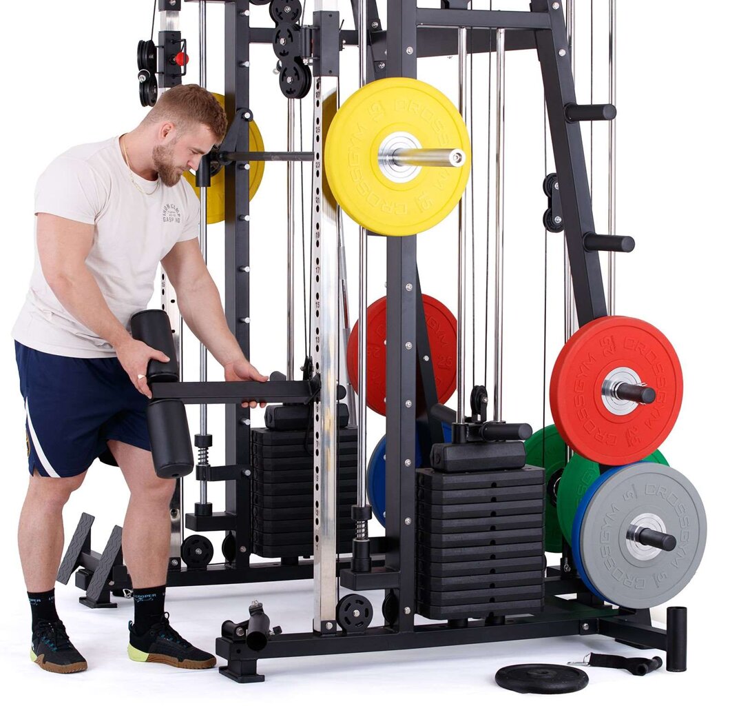 multifunkční multipress se stojanem na činku, výškově nastavitelné kladky, hrazda bezpečnostní dorazy, pojezd lineární ložiska na kotouče s vrtáním 25, 30, 50 mm + sada závaží 2 x 60 kg max. nosnost až 350 kg pro domácí a lehce komerční využití záruka 2 roky